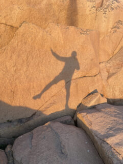 Återigen vandrar vi rätt ut från dörren tillsammans med Pelle och kommer snart fram till Tångevik och går upp på Tångehuvud och hänförs av de av istiden slipade röda granithällarna. Här ser man också tydliga spår av stenhuggarepoken. Vi följer sedan kustlinjen och har en pampig utsikt över havet i väster. Stigen böjer inåt och land och vi kommer in en skog innan vi återigen vandrar genom klippornas rike ned mot Grosshamns gröna strandängar. Efter en kort sektion av asfalt närmar vi oss gården Fykan, tar oss över en sektion med blockterräng och upp på dramatiska Sote Bonde. Vi vandrar återigen på granithällar söderut, blickar ut över Kung Tryggves grav på Tryggön och kommer sedan fram till Habo ängar. Har vi tid vadar vi över till Tryggön och beundrar det stora röset.
