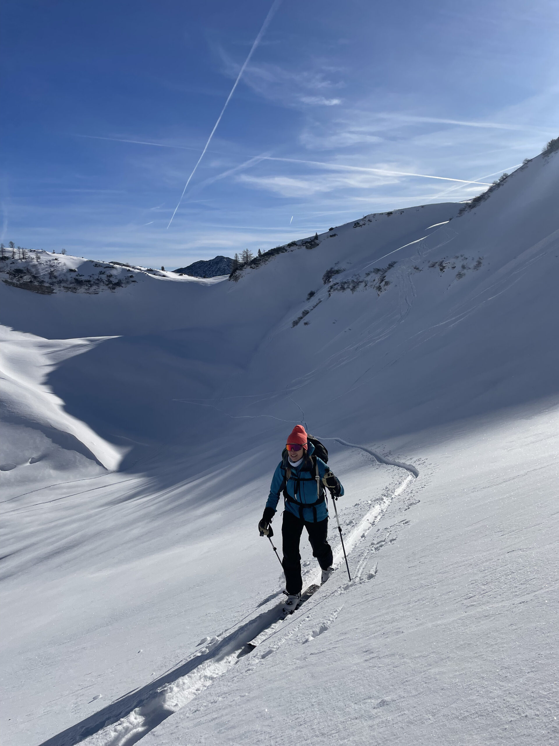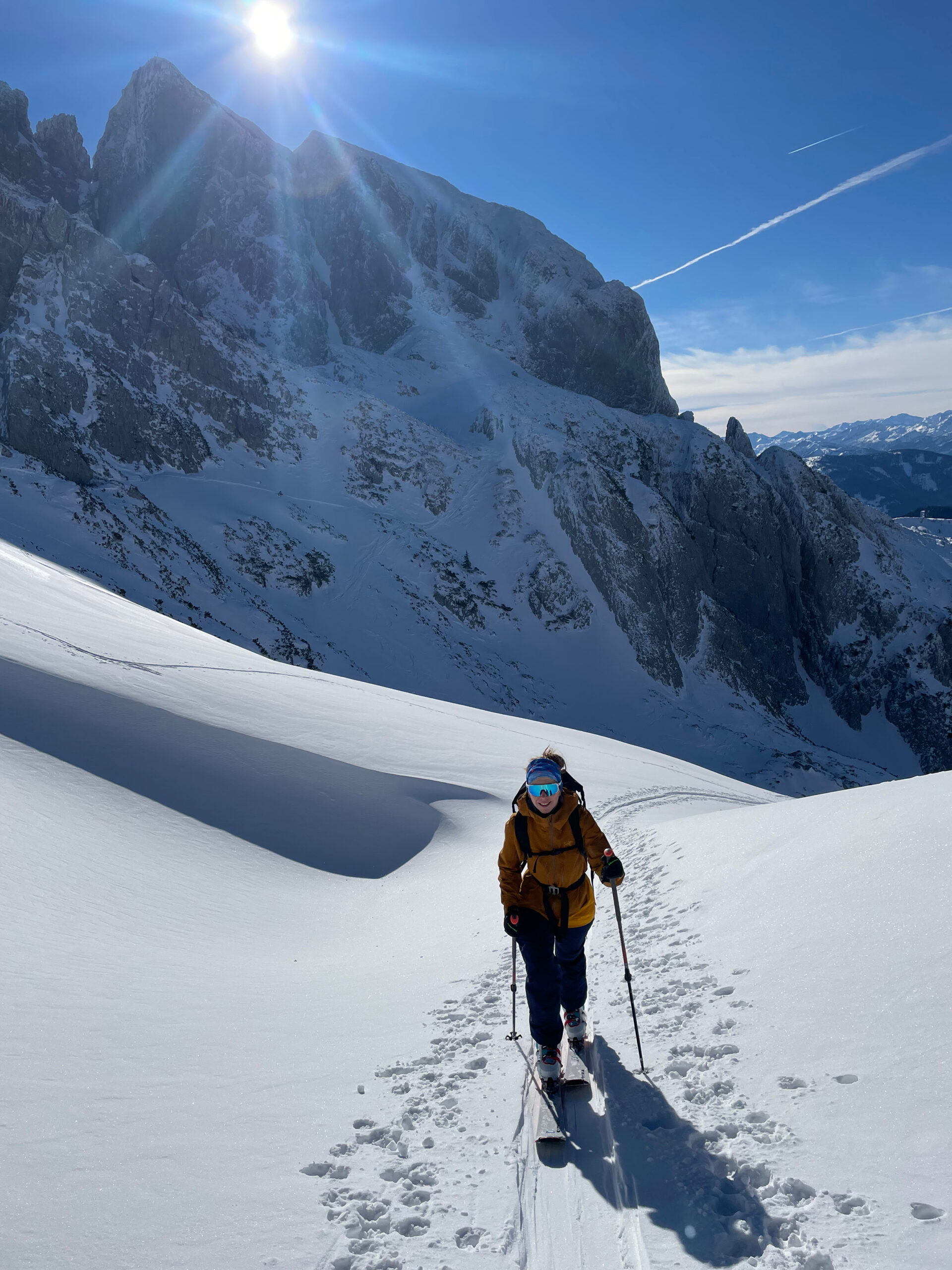 Mellan de dramatiska taggarna i Gosaukamm breder ett nätverk av sadlar, branta rännor och kittlar ut sig – helt jämförbart med toppturer i Dolomiterna. På nordsidan håller sig snön ofta som kall, lätt puder, medan sydsidorna snabbt övergår till fastare firnsnö under vårvintern. Ett område som bjuder på teknisk variation och storslagen natur.