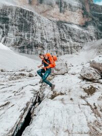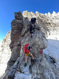 Vi äter en god hyttfrukost och möter återigen upp våra italienska bergsguider för lite mer Via Ferrata. Idag kommer vi ta oss an Bocchette Centrale, som av de flesta anses vara den vackraste och mest uppskattade Via Ferrata-leden i Dolomiterna. Via den numera krympande glaciären tar vi oss först upp till passet där Bocchette Centrale börjar. Väl igång bjuder ”Centrale” oss på riktigt luftiga stigar där vi hela tiden är säkrade i vajer. Vi tar oss under dagen både upp och ner för ledens många stegar och passager. Efter en stund passerar vi helt nära, den magnifika Campanile Basso, som är en av klättrarnas många favorittoppar.