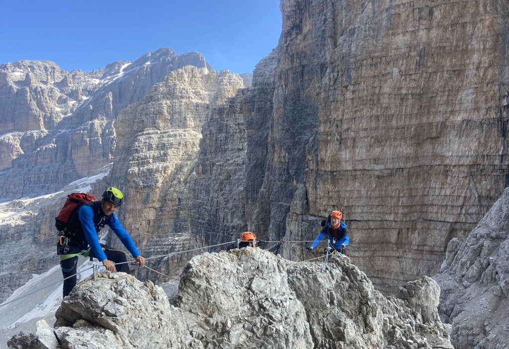 Under fem dagar utlovas krävande klätterstigs-vandring med spännande och luftiga passager med fantastiska vyer. Vi rör oss hela tiden i högalpin terräng och bor i mysiga bergshyttor under vår vandring. I två dagar kommer vi följa riktigt exponerade Via Ferrata stigar under ledning av lokala certifierade IFMGA/UAIGM bergsguider. Vi bär dock själva med oss klätterutrustning och det nödvändigaste för våra dagarna på berget. Denna plockar vi upp på guidekontoret i Madonna innan vi ger oss upp i bergen. Övriga dagar vandrar vi på lite mindre avancerade stigar men utrustningen kan vara bra att ha med under hela turen.