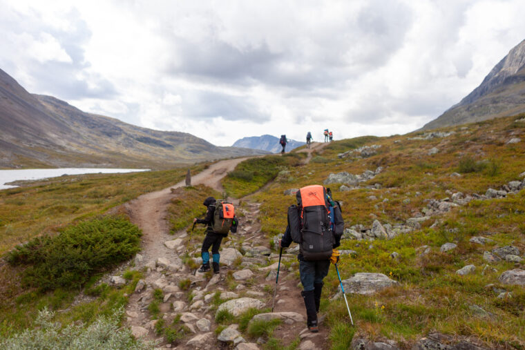 Vi börjar dagen med att vandra till Kebnekaise fjällstation där vi stannar en stund för att se in i den gamla delen av stationen och ta en god kopp kaffe innan vi vandrar ut ovan trädgränsen och kalfjället. Vi går över träbron, hängbron, förbi dansbanan och in mellan bergen. Här någonstans försvinner mobiltäckningen. Vi tar småpauser med jämna mellanrum, fyller på med energi och njuter av vyerna medans vi gör så. Dagens mål är att ta sig förbi de små sjöarna söder om vår vandringsstig och då vattnet påbörjar sin resa ner mot Singi faller vi också ner en bit för att sedan slå läger med fantastisk utsikt. Om kvällen är fin sätter vi även upp tarpen och samlas under den för att prata och äta tillsammans innan det är dags att krypa in i tälten och sova.