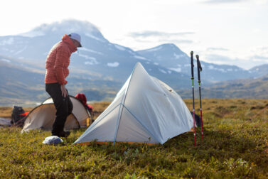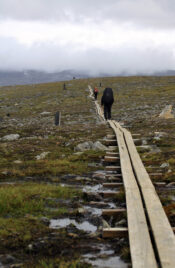Idag kommer det bli en del spång blandat med sten och några enstaka hängbroar. Vi har vandrat mer än halvvägs och det är nu närmare till Abisko än att vandra tillbaka mot Nikka. Vi kommer se Alesjaure stugorna långt borta vid sjön beläget på en liten kulle men har fortfarande långt kvar då vi ser dom. Väl där finns det en kiosk och möjlighet till fika inomhus med fönster som vätter söderut. Kanske känner du igen vyn från de många bilderna som finns från området. Kanske har du även sett att denna vy finns på kartongen till vissa Primus kök när du köper dem? Om du frågar personalen kanske de kan visa pärmen eller berätta om taxiföraren som började komma hit efter att ha sett den svartvita filmen om Kungsleden. Det finns även ett vattenfall en bit förbi samevistet som heter fantomens fall. Kan du gissa varför? När vi känner oss redo vandrar vi den sista biten till den lilla halvön som sticker ut och tältar på stranden där. Vi hoppas på en fin kväll med chans på ett snabbt bad men blåser det gömmer vi oss lite i ljungen som det finns gott om.