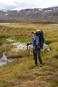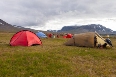 Efter Sälka går vi fortsatt norrut in mot passet. Kungsledens högsta punkt och även våran. Vi smyger upp i vårt eget tempo och samlas vid meditationsplatsen för en gruppbild med sagolik vy i bakgrunden. En stund senare står vi vid toppstugan och har möjlighet att se åt båda hållen. Vissa år kan det vara ett litet snöfält här och då kan man kasta några snöbollar om man känner för det. Från toppstugan är det neråt. Vi passerar förbi månlandskapet med mängder av sten och kommer sedan ut på gräsfälten som påminner om scener från Sound of Music. Vi tar oss över en bredare men lätt jokk och vandrar sedan den sista kilometern ner på det stora platta gräsfältet där vi kommer slå läger för natten. Om det är läge för det har vi även möjlighet att spatsera runt lite på kvällen. Det finns en gammal torvkåta, ett jättefint vattenfall och även bra jaktmarker för att hitta renhorn liggandes på marken.