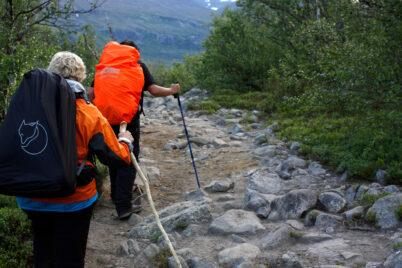 Vi börjar kanske dagen med en god kopp kaffe innan vi packar ihop bohaget för sista gången och vandrar in i Abisko nationalpark. En bit in i parken på vår vänstra sida passerar vi ett fortifikations minne som vi kan besöka vid intresse och även Abiskojaure stugorna är tillgängliga för ett besök då vi passerar dessa. Det blir en hel del spång och så småningom enklare grusvägar. Vi ser en sjö till vänster som vi passerar i sin helhet. Vi passerar en torvkåta och ser sedan vattnet som blir vildare och vildare då det lämnar sjön. Vid den lilla lägerplatsen mellan hängbroarna tar vi en paus. Vi kollar vedförrådet och om det finns ved lagar vi mat här medans vi njuter av lite eldflammor och värmen därifrån. Vid canyonen stannar vi åter för en gruppbild och tar 10 minuter för reflektion över dagarna som varit. Det brukar låta en del då vattnet strömmar kraftfullt men det är också väldigt fint här. Vi vandrar under järnvägen och stora vägen, kollar på målningarna, passerar rallarmuseet och tar de sista backarna upp till fjällstationen. Vi är framme vid vårt mål! Här väntar en varm dusch, god mat, bastu om man vill och sist men inte minst en säng.