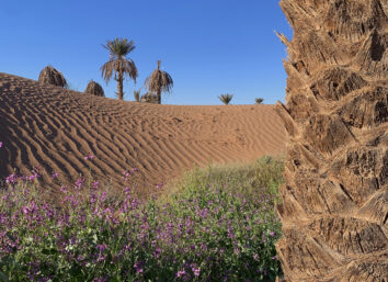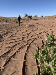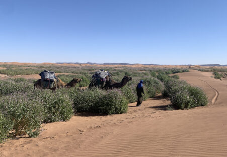 M’hamid är verkligen vid vägs ände, vid vändhållplatsen finns en skylt illustrerade med dromedarer som anger antalet dagsmarscher till Timbuktu i Mali. Vår vandring tar oss sydväst längs med Draafloden och vi går genom ett landskap av mindre sandyner och stenökenpartier. I söder reser sig en bergskedja som utgör gräns mot Algeriet, i nordväst en utlöpare av Anti Atlas. Det finns förvånande mycket vegetation, både buskar och träd och blommor. Floran är dock avhängig hur mycket nederbörd som fallit, men under höst och tidig vinter kan det komma en del regn. Vi har sett öknen blomma!