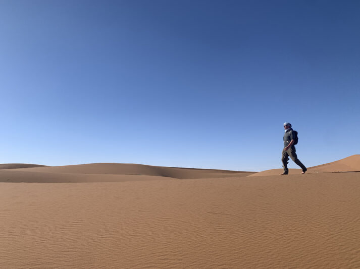 Vi har rest till Marocko sedan slutet av 1990-talet och gjort många färder på egen hand för att hitta uppslag till spännande resor. Trots att vi kuskat runt i landet i snart 30 år så finns vita fläckar på kartan. Utgångspunkten för vår ökenvandring är i närheten av byn M’hamid, som ligger i mitten av Marockos sydliga gräns. Där har vi varit tidigare men aldrig vandrat några längre sträckor, ja inte förrän vintern 2025. Det som mötte oss då överväldigade. Att vandra i en sandöken är lite som att skida genom ett gnistrande, orört fjällandskap. Det är tyst och vidunderligt vackert.