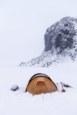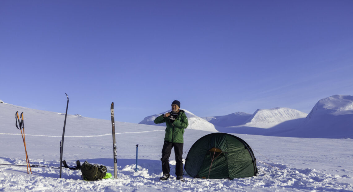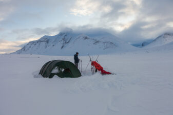 Vi gör upp vårt läger så snart vi kommer över. Det kan hända att vi får sätta upp våra tält i pannlampornas sken beroende på hur snabbt vi tagit oss över sjön, kanske får vi även hjälp av norrskenet. En tuff men härlig start kanske, men sedan är det extra gott att äntligen få sträcka ut benen och vila.