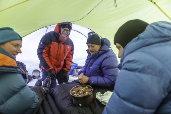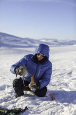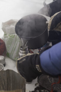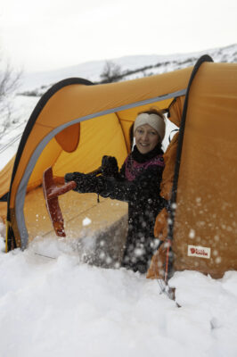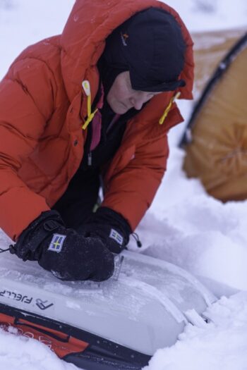 Många pulkor har dragits här innan våra men ändå känns det ofta inte så. Vinterlandskap med dess stenblock, tunn is, kalla vindar och ibland cornflakesliknande frost ger oss mycket att utforska. Vi lagar mat och fixar vår utrustning i tälten skyddade från vinden medan ljuset från pannlamporna och stearinljuset i absiden lyser upp våran kväll. Efter några dagar är det normalt att ta på sig skidorna och utan stavarna ta sig iväg en bit för att göra kvällsbestyren. När man står och borstar tänderna med krabbliknande vantar och tjock dunjacka, är det svårt att inte blicka uppåt. Forskande kolla på stjärnorna eller de stora yrande snöflingorna. Norrskenet som börjar dansa så smått och det inbjudande tältet som lyser så fint. Det är lätt att känna sig tillfreds och lyrisk men också sårbar.