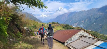 Vandringen tar oss till norra Pokhara/Annapurna Himalområdet, omtyckt bland många vandrare världen över. Vandringen tar oss genom rododendronskogar och vackra terrassodlingar. Stigarna slingrar sig genom små byar och vi kommer i kontakt med många olika slags kulturer. På högre höjd domineras befolkningen av gurung- och magarfolket och på lägre höjd av brahman och chetri. Vi går längs med gröna kullar, terrassodlingar, skogar och fortsätter uppströms längs floden Modi Khola för att slutligen nå Annapurna Base Camp på 4130 meters höjd.