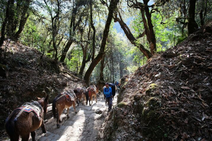 Vandringen till Deurali blir relativt kort då vi tar det försiktigt med tanke på risk för höjdsjuka. Stigen går genom en vacker skog av rododendron och bambu med vy över förtrollande vattenfall på båda sidor av floden.