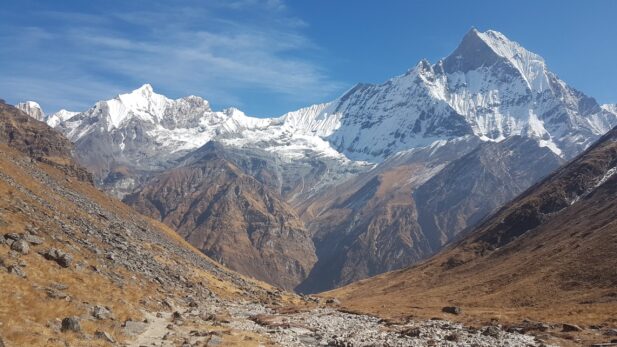 Idag går vi upp tidigt för att starta vår vandring mot Annapurna Base Camp. Vi är nu uppe på hög höjd och det alpina landskapet börjar synas. Vi följer floden för att nå Machapuchare Base Camp (3 700 m). Här kan vi stanna för en kopp te innan vi fortsätter uppåt i långsam takt.