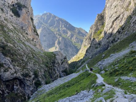 Vi början vandringen rätt utanför hotelldörren i Poncebos, där en medeltida bro spänner över Caresfloden och markerar startpunkten för dagens vandring. Vi kommer att gå genom den dramatiska bergsklyftan Garganta del Cares – en klyfta som är över 1000 m djup och 11 km lång. Den konstruerade stigen har blästrats in i bergsytan och byggdes ursprungligen på 1940-talet som en del av ett vattenkraftverk. Idag är det en av Spaniens mest populära vandringar. På vissa platser skär stigen in i klipporna och endast genom tunnlar och broar är det möjligt att ta sig igenom hela klyftan. Vandringen är relativt flack, med endast en liten stigning. Vi kommer fram till Cain där vi äter lunch. Vi återvänder sedan till vårt hotell i Poncebos.