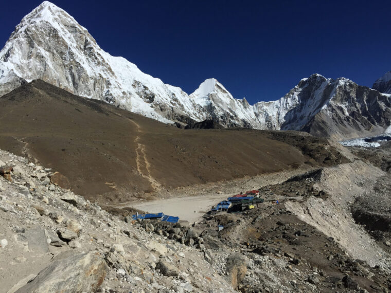 Idag är det den stora dagen. Höjden känns av så vi tar det lite lugnt och vandrar upp mot Everest Base camp via Gorak Shep efter tidig frukost. (Bra att kunna komma iväg ca 06.30). Vi kommer inledningsvis att ha fin utsikt över Nuptse, Loboche och andra toppar och gå vid sidan av en mindre glaciär. Efter ett stopp i Gorah Shep vandrar vi vidare upp mot Base Campområdet längs med Khumbuglaciären och när vi nått 5400 meter är vi så nära Everest vi kan komma utan att behöva klättra. Utsikten över Khumbus isfall och berget är minst sagt spektakulär. Vi går därefter tillbaka till Gorak Shep.