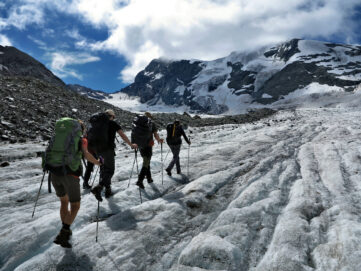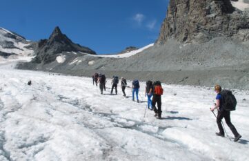 Efter en tidig frukost tar vi bussen till Arolla, där dagens vandring börjar. Det blir en lång och utmanande dag, full av fantastiska upplevelser! Idag befinner vi oss vid Arollaglaciären, strax under Mont Collons imponerande nordsida. Här möter vi vår bergsguide, som leder oss i ett replag över glaciären. Eventuellt kan vi behöva använda stegjärn – en perfekt chans att sätta våra tekniska färdigheter och fysiska styrka på prov om det krävs!