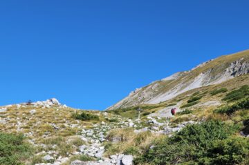 Stigen är relativt lätttrampad och mot slutet vandrar vi längs en rygg innan vi når toppen. Utsikten från Plat är en av de bästa vi kan få över hela Sharbergen. Därefter går vi ner till sadeln vid toppen och vidare till övre Leshnica-dalen fram till vårt nattläger.