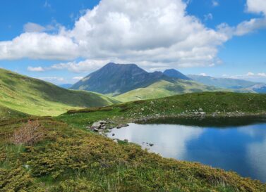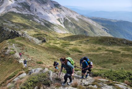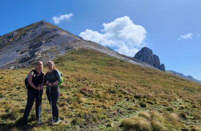 Efter frukost gör vi oss redo för dagens vandringsäventyr. Vi följer inledningsvis en liten stig som leder oss genom relativt snäll terräng. Snart blir det brantare och stenigare vilket skänker extra krydda till dagens utmaning. Då och då stannar vi till och njuter av Lubotens imponerande klippor. Vi når sedan en bergskam som utgör gränsen till Kosovo och vandrar längs denna och vidare ned till den högt belägna Livadica-sjön.
